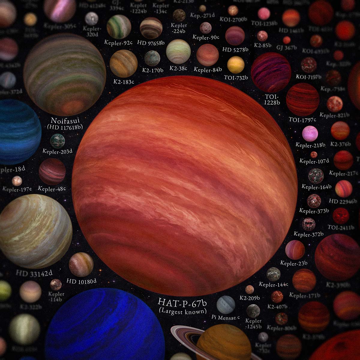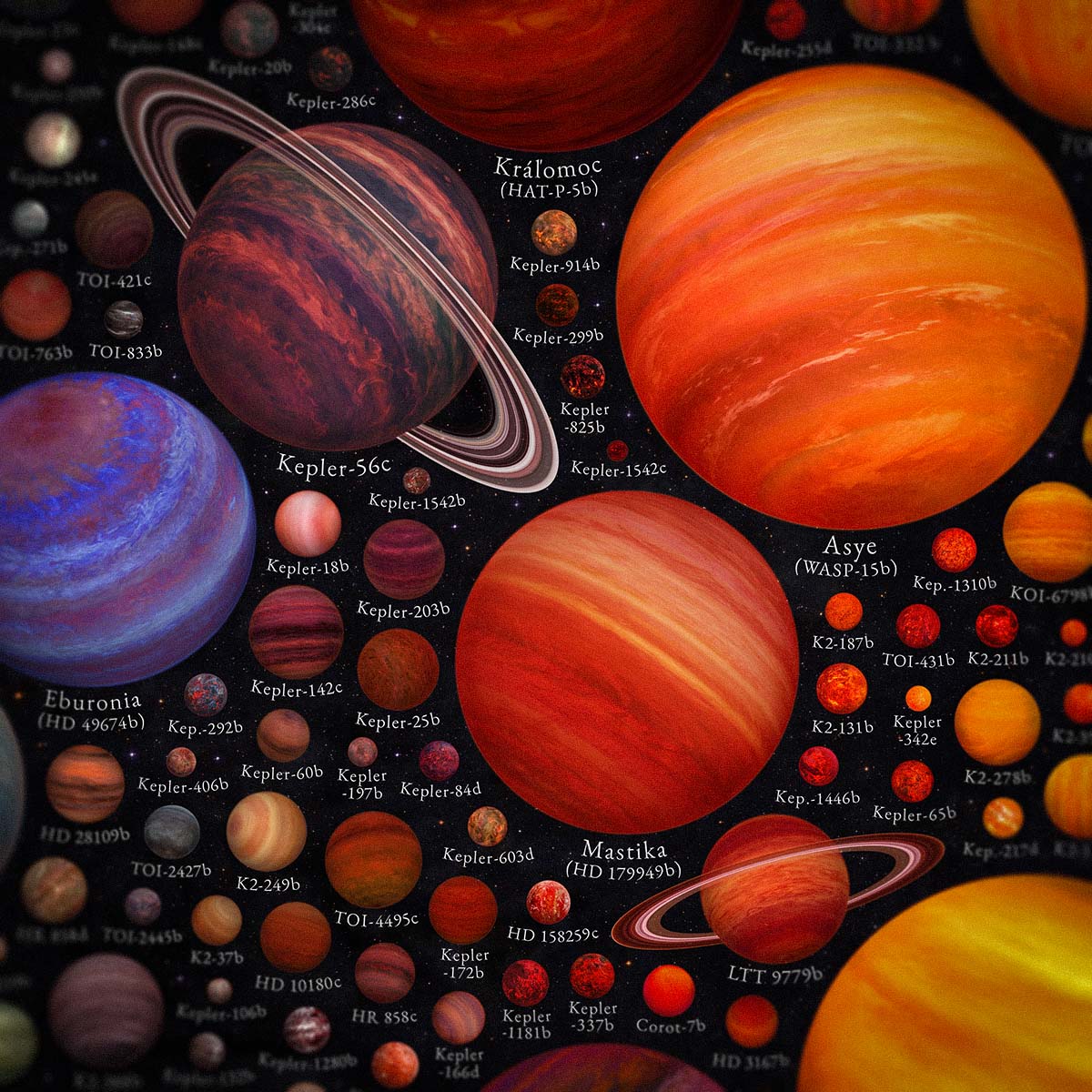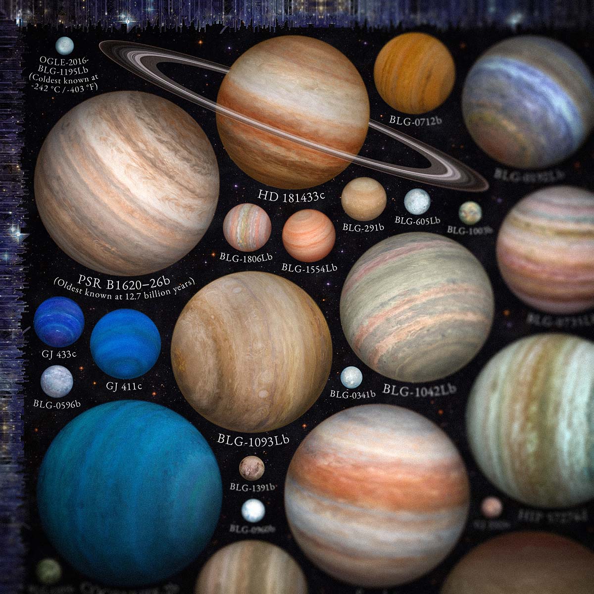 A cosmic gallery of over 1,100 known exoplanets, arranged by temperature and size. See the diversity of worlds beyond our solar system in breathtaking color.