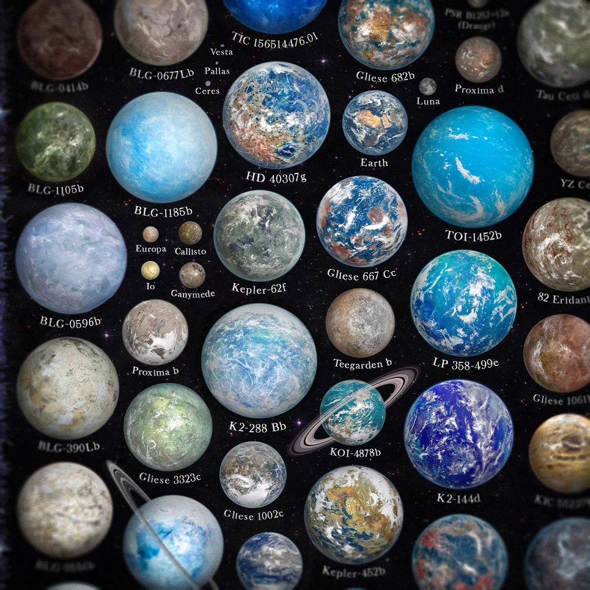 A fascinating atlas of over 900 alien worlds. Compare the surfaces, climates, and potential habitability of rocky planets across the galaxy.